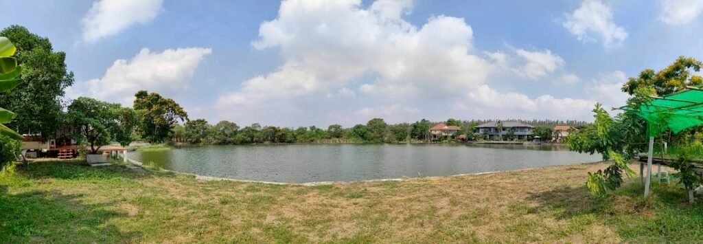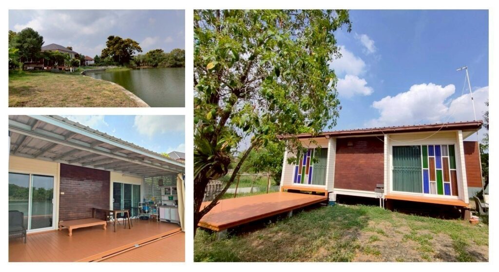 ที่ดินพร้อมบ้านพักชั้นเดียว 375 วา 2 นอน 1 น้ำ 2 ระเบียงหน้า หลังติดริมทะเลสาป ทำเขื่อนริมน้ำตลอดแนว ปลูกต้นไม้ร่มรื่น